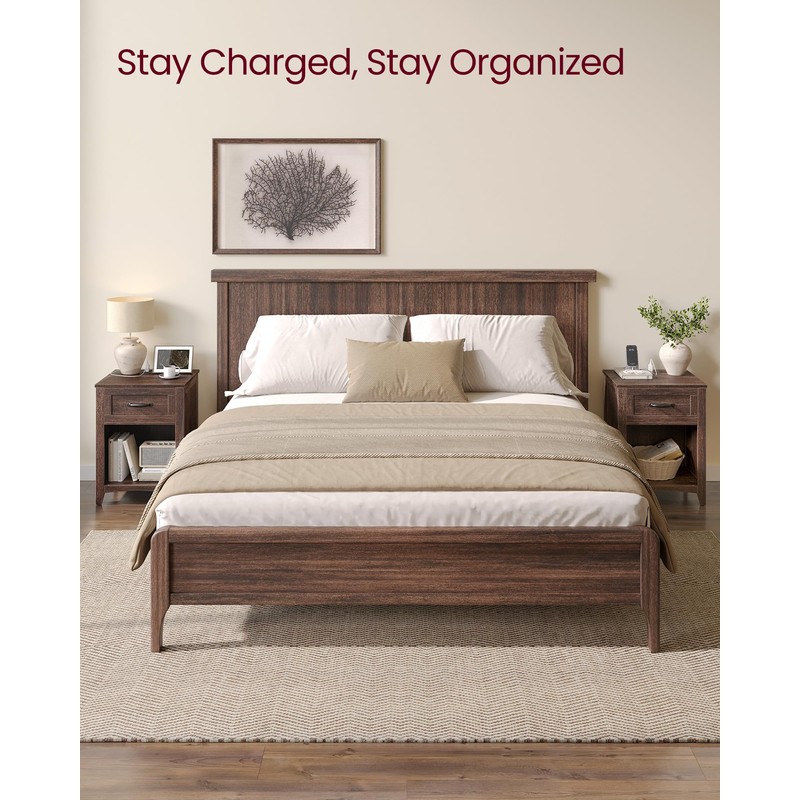 VASAGLE Farmhouse Nightstand with Charging Station, Bedside Table with Drawer, Open Compartment, Side Table with Storage, for Bedroom, Maroon Brown ULET659K51
