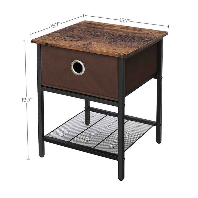 Specifications:- Color: Rustic Brown, Black- Material: Particleboard, Steel, Fabric and Cardboard- Product Size: 15.7”L x 15.7”W x 19.7” (40 x 40 x 50 cm)- Product Weight: 7.1 lb (3.2 kg)- Max. Static Load Capacity of the Surface: 44 lb (20 kg)- Max. Static Load Capacity of the Drawer: 11 lb (5 kg) Package Contents:- 1 x Side Table- 1 x Assembly Kit- 1 x Instructions VASAGLE Notes:- Children are not allowed to climb on or play with the product for safety reasons.