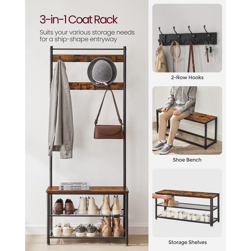 VASAGLE Coat Rack, Hall Tree with Shoe Storage Bench, Entryway Bench with Shoe Storage, 3-in-1, Steel Frame, for Entryway, 12.6 x 27.6 x 68.9 Inches, Industrial, Rustic Brown and Black UHSR41BX