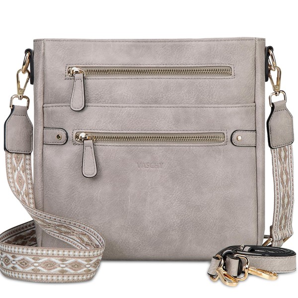 VASCHY Crossbody Bag for Women, Fashion Vegan Leather Medium Multi-pocket Cross Body Ladies Handbag Purse with Guitar Strap,Gray