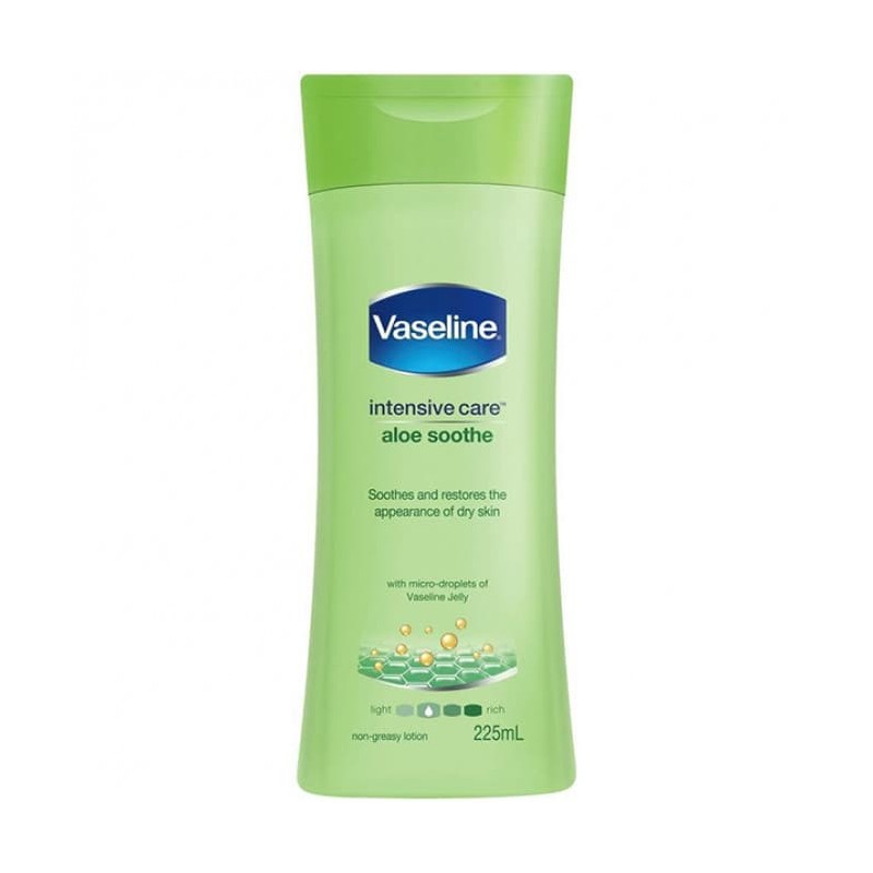 Vaseline Intensive Care Body Lotion Aloe Soothe 225ml, restores the appearance of dry skin. Vaseline Aloe Soothe Lotion soothes and restores the appearance of dry skin. We believe healthy skin starts with deep moisture*. In our Intensive Care™ Aloe Soothe Lotion we’ve combined micro-droplets of Vaseline® Jelly with aloe vera in a refreshing, fast-absorbing formula. The result is a skin lotion that calms and soothes the discomfort associated with dry, irritated skin and leaves it feeling deeply* moisturised. *Within stratum corneum. Absorbs fast for a non-greasy feel. Vaseline® Petroleum Jelly is the original wonder jelly. Vaseline has long been used to manage symptoms of many severe skin conditions. It literally melts into the skin, flowing into the tiny cracks caused by dryness where moisture is needed most. In this way Vaseline acts as an extremely powerful skin moisturiser to provide a barrier against water loss from already dry skin and help protect against the effects of weather and exposure. Our petroleum jelly is triple-purified to be 100% pure. Vaseline® believes that truly healthy skin starts with deep moisture. It’s not something you get by masking problems or through quick fixes. We know this because we are the original skin experts. Founded in 1870 by Robert Chesebrough, Vaseline® has been safely helping care for skin for over 140 years.