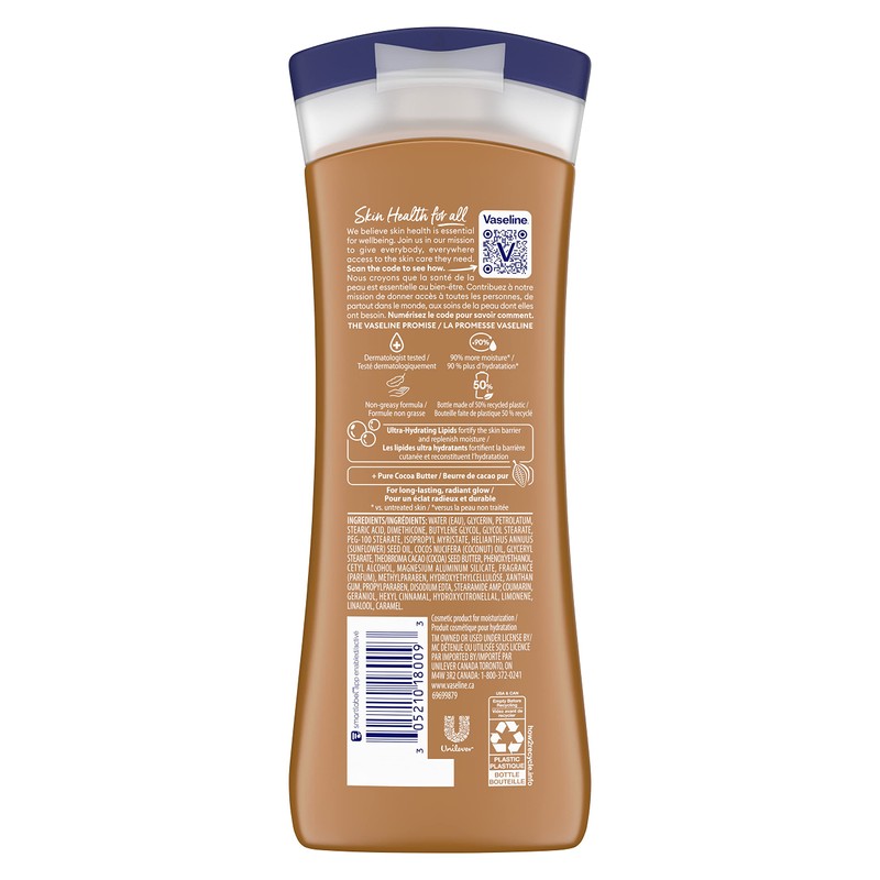 - Vaseline Intensive Care Cocoa Radiant Body Lotion comes in a bottle made using 50% recycled plastic