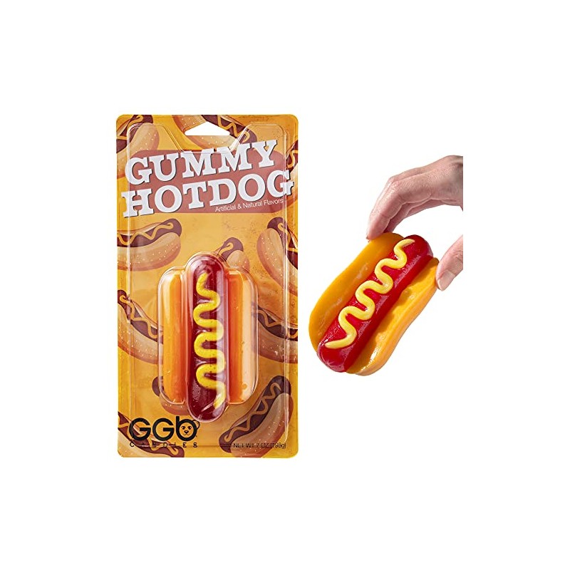The Vat19 Gummy Hot Dog recreates your favorite drive-thru snack using nothing but gummy. This delicious treat has the shape, color, and detail of a real hot dog without the meat or grease flavors. Chow down on this yummy gummy hotdog rendered with layers of delicious fruit flavors: orange (the bun), cherry (the hot dog), and lemon (the mustard). This treat is hand made in the USA in a SQF (Safe Quality Food)-certified facility.