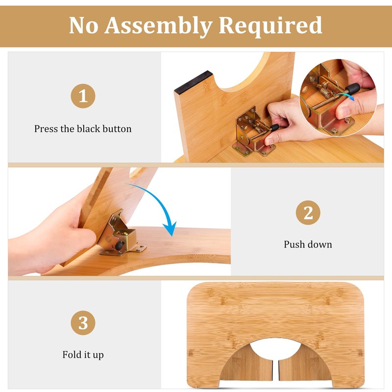 - [Meet Different Needs & Save Space] This versatile product serves as both an adult and kids' toilet stool. At 7 inches in height, it meets the needs of most people and fits various toilet heights. The foldable bamboo design conforms to most toilet's shape, optimizing space and reducing installation time. When not in use, it stores easily, maintaining a neat and organized bathroom space.
