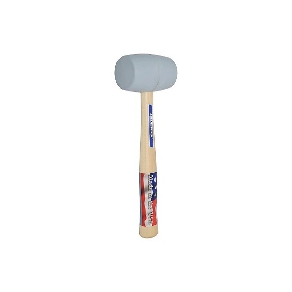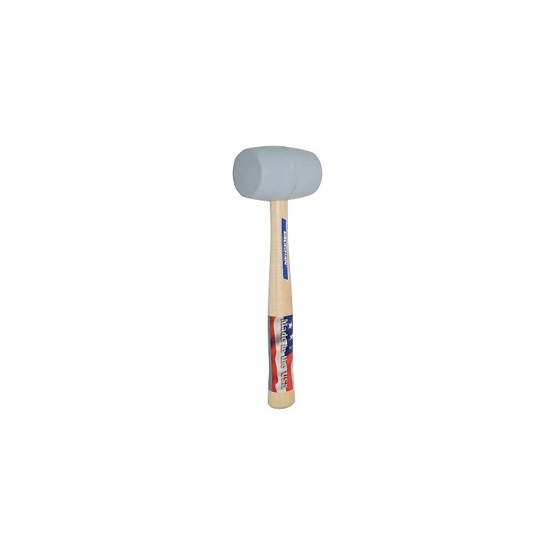 The Vaughan RM2W Solid Rubber Mallet is designed for durability with a head weight of twenty ounces. Its overall length is ten and five-eighths inches and it features a hardwood handle for a secure grip. This mallet is suitable for various applications in woodworking and construction where a solid blow is necessary without damaging surfaces.