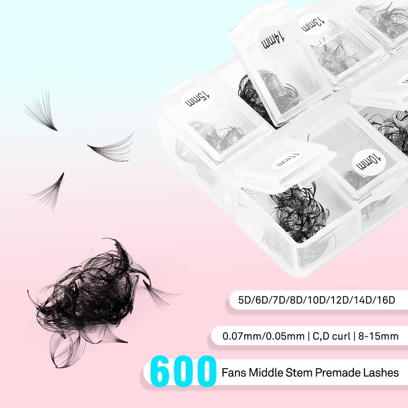 - Cost-effective,vavalash premade loose fans come in packages of 600 fans/box,equivalent to 5 boxes of 12 rows of premade fans.Each box has 8 separate grids.(8mm/9mm/10mm/15mm 50 Fans per grid, 11mm/12mm/13mm/14mm 100 Fans per grid)