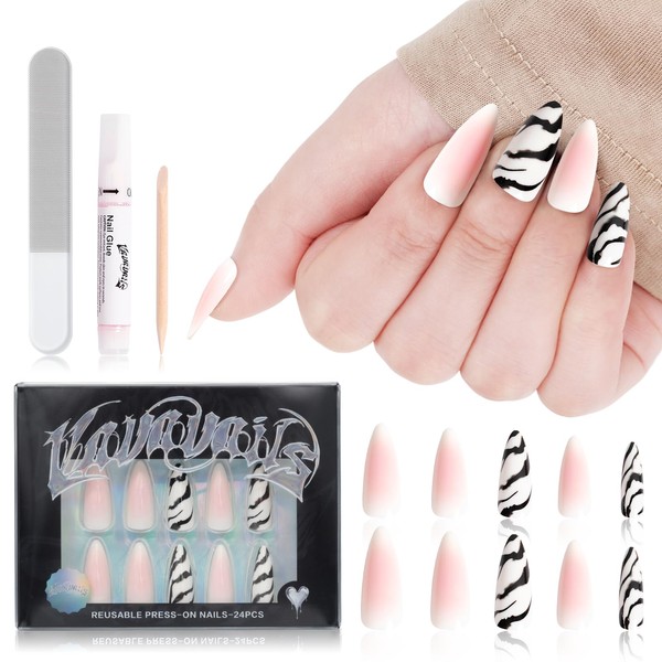 VAVAVAILS Press On Nails Non-Transparent Long Stiletto Almond False Nails, Full Cover Pink Blush and Zebra Strips Black Line Fake Nails, Reusable 12 Sizes - 24 Nail Kit with Glue & Jellied Gel