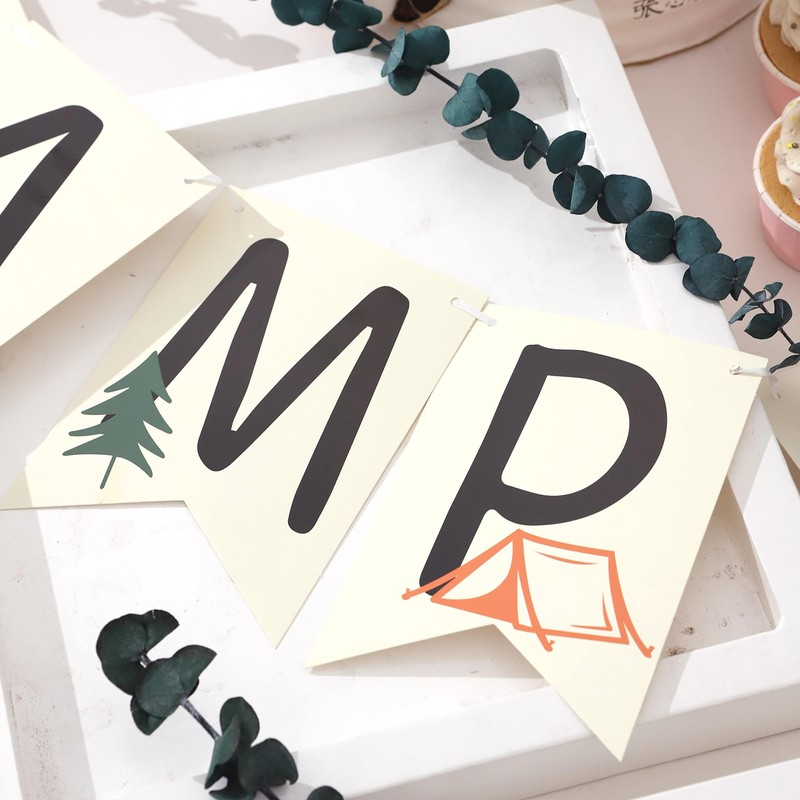 - UNIQUE DESIGN - This card paper banner is suitable for camping birthday theme, ivory color swallowtail flag, black letters, grey/white mountains, olive trees, light orange/light grey tent, tan/orange/yellow campfire as shown. Combines into a beautiful "HAPPY CAMPER" printed cardboard banner