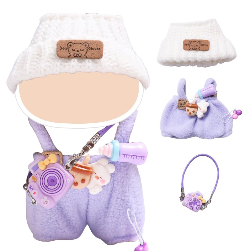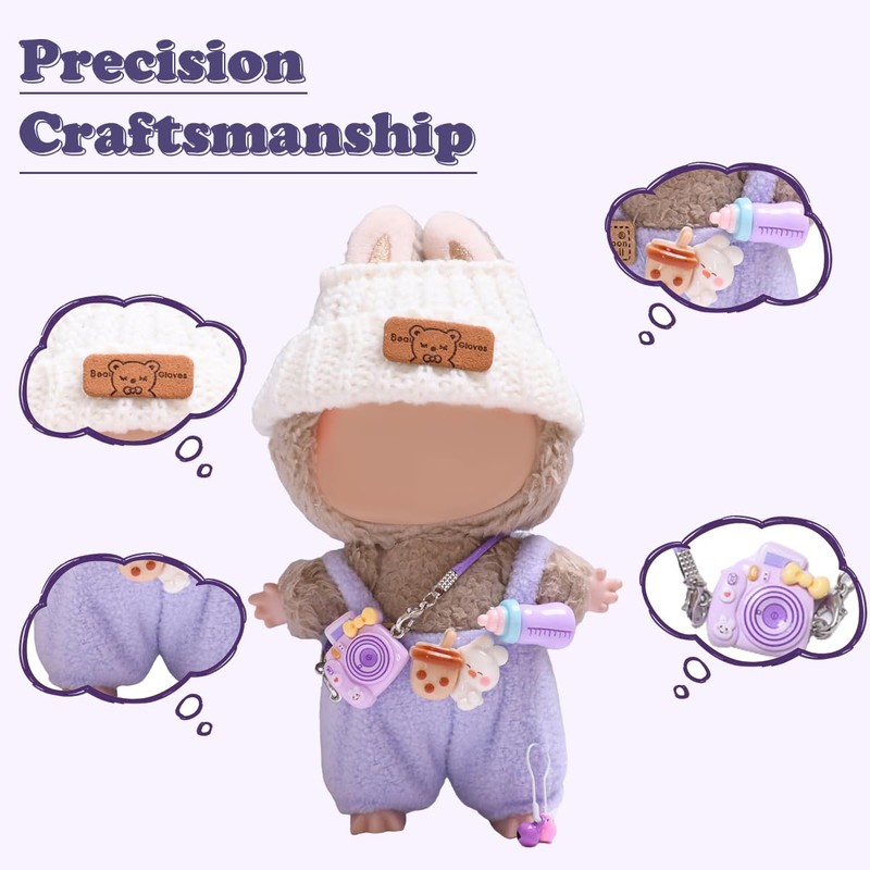 Vavious Doll Clothes 3-Piece Handcrafted Crochet Set for 17cm Dolls Outfits Premium Fashion Suit with Overalls + Hat + Camera Stylish Doll Apparel Accessories (Purple Style 2)
