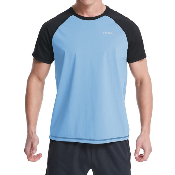 VAYAGER Men's UV Rash Guard T-Shirt Swimming Shirt UPF 50+ Swimming Shirts, Quick Drying, Loose Fit, Water Surf Shirt, Sky blue-black