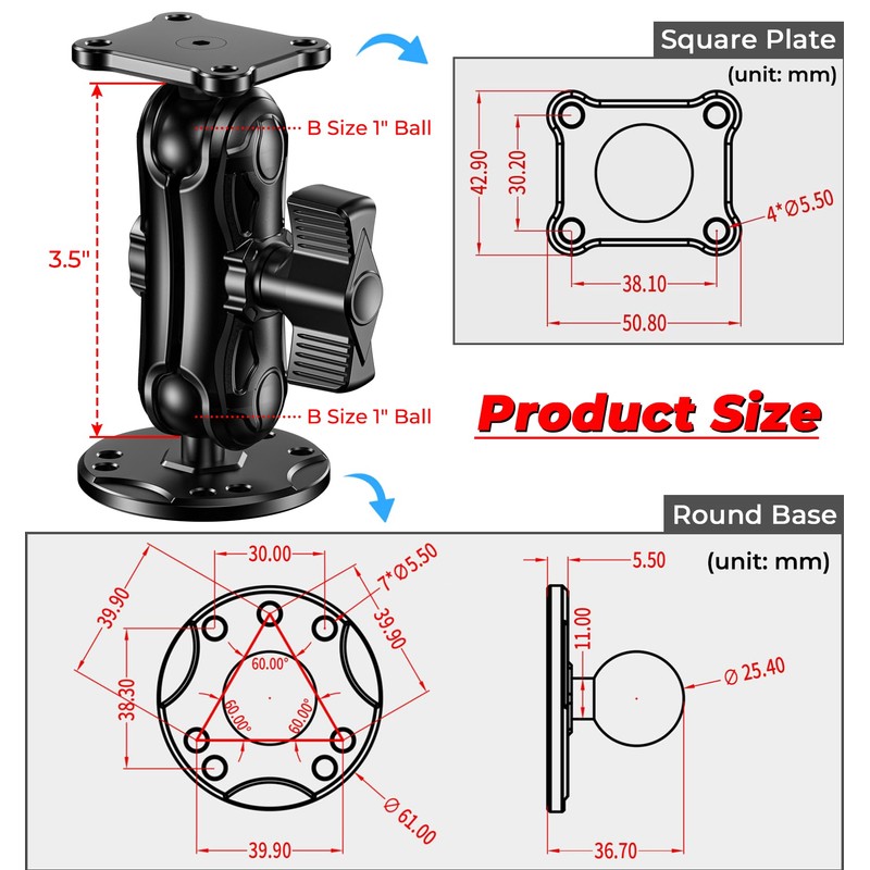 - Package List: 1" ball round base x1, 3.5" length medium double socket arm x1, 1" ball square plate x1