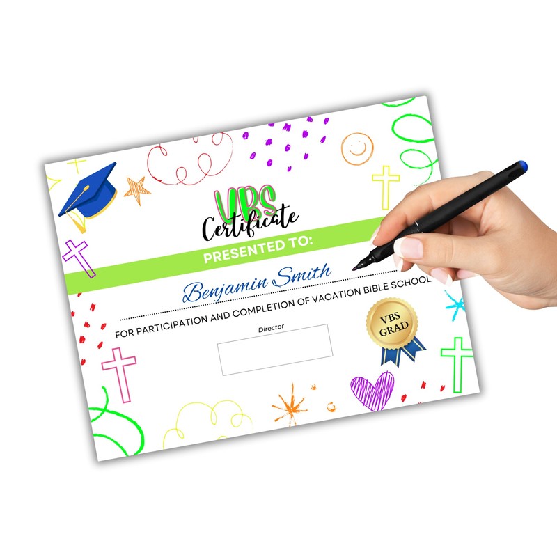 - Fill in the Blank: Our VBS Certificate of Completion is made with convenient fill-in-the-blank spaces, allowing you to easily personalize each certificate with the participant's name, date of completion, and other relevant details. A wonderful certificate of their attendance!