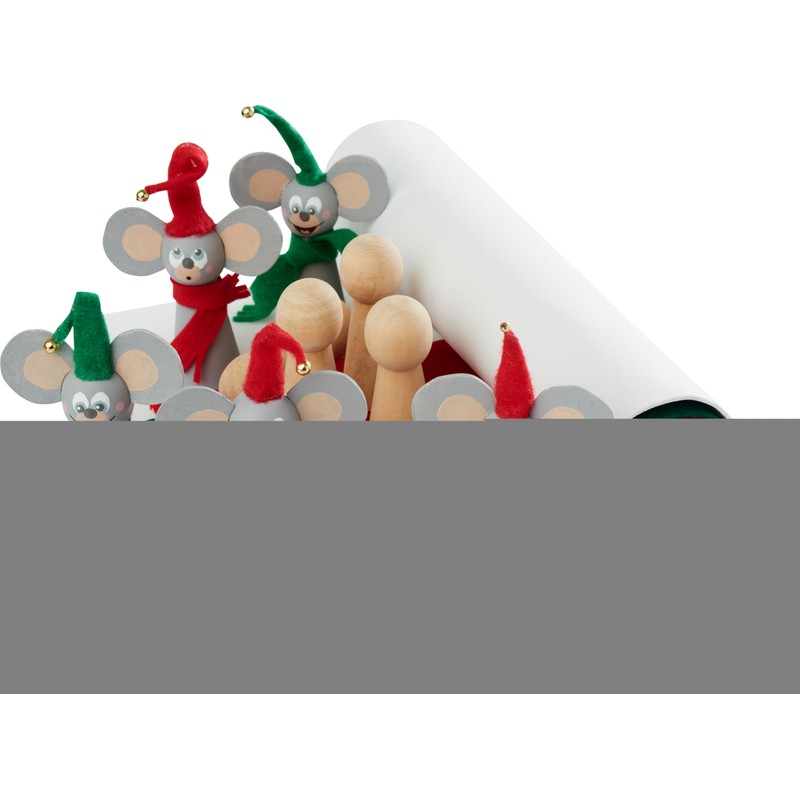 VBS craft set "Christmas mice" for crafting 5 cheeky mice made of wood, craft felt and foam rubber. The finished mice have a size of approx. 11 - 12.5 cm, depending on how long the pointed hat is made. A great decoration for the Christmas windowsill, on a tray, windowsill or dresser. With the help of a fairy lights, decorative snow, scattered parts and other Christmas accessories, a great decoration for the Christmas season is created. In addition, pens or craft paints are required to paint the faces as well as scissors.