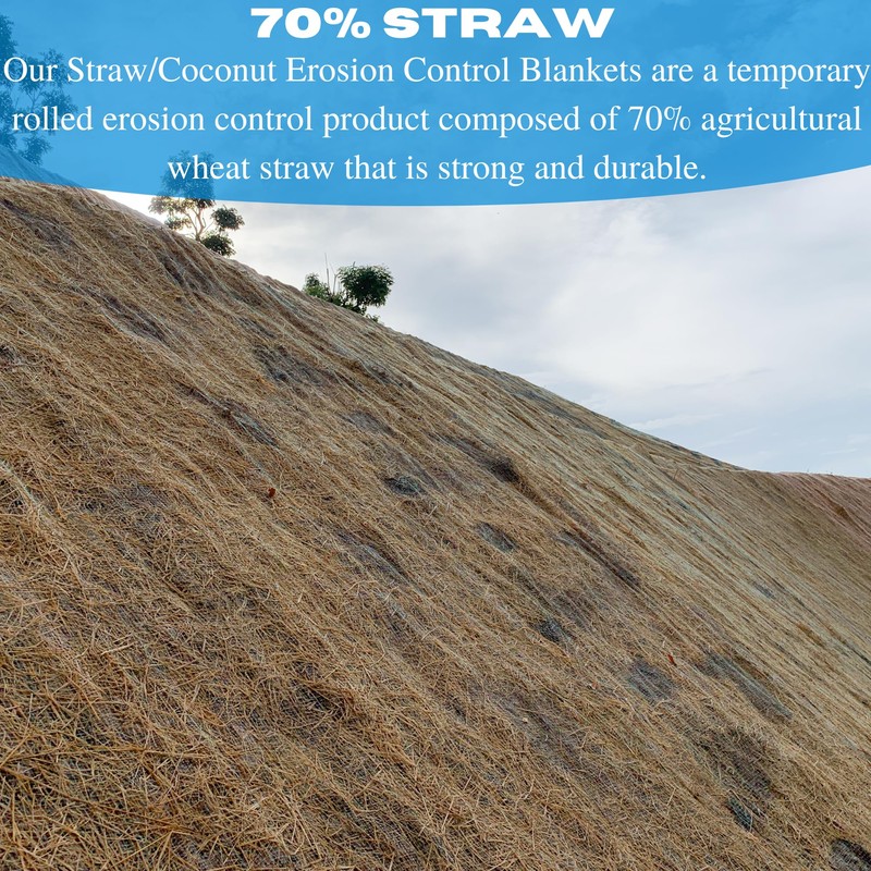 • 70% Straw - Our Straw/Coconut Erosion Control Blankets are a temporary rolled erosion control product composed of 70% agricultural wheat straw that is strong and durable.