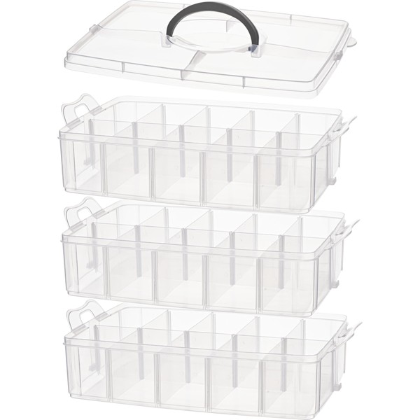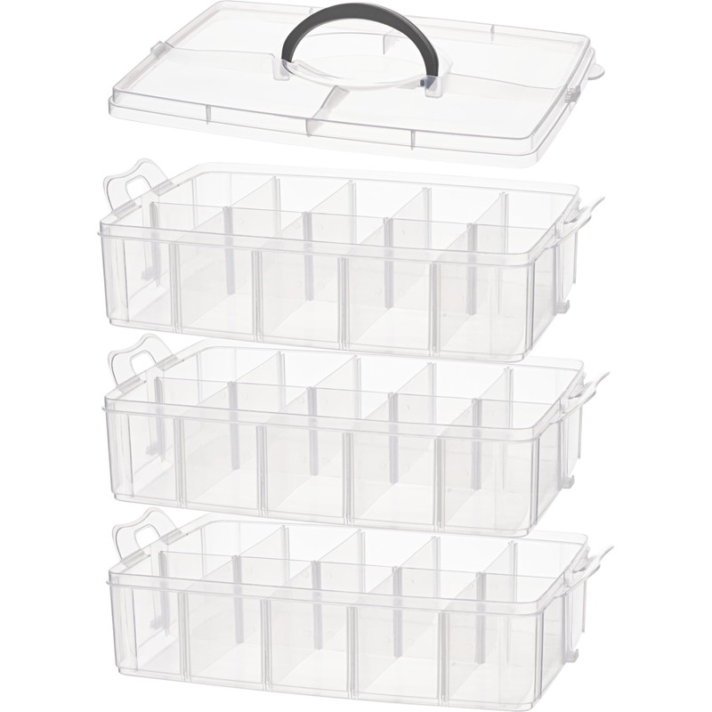 The practical VBS stacking box with handle consists of three levels and a lid. The size of the box is approx. 24.5 x 16.5 x 18 cm. The material is plastic. The boxes are joined together with a click closure. Each tier has 10 compartments of approx. 4.8 x 8 cm. The dividers can be removed. A handy box that is always at hand with plenty of space for screws, scatters, beads and more.