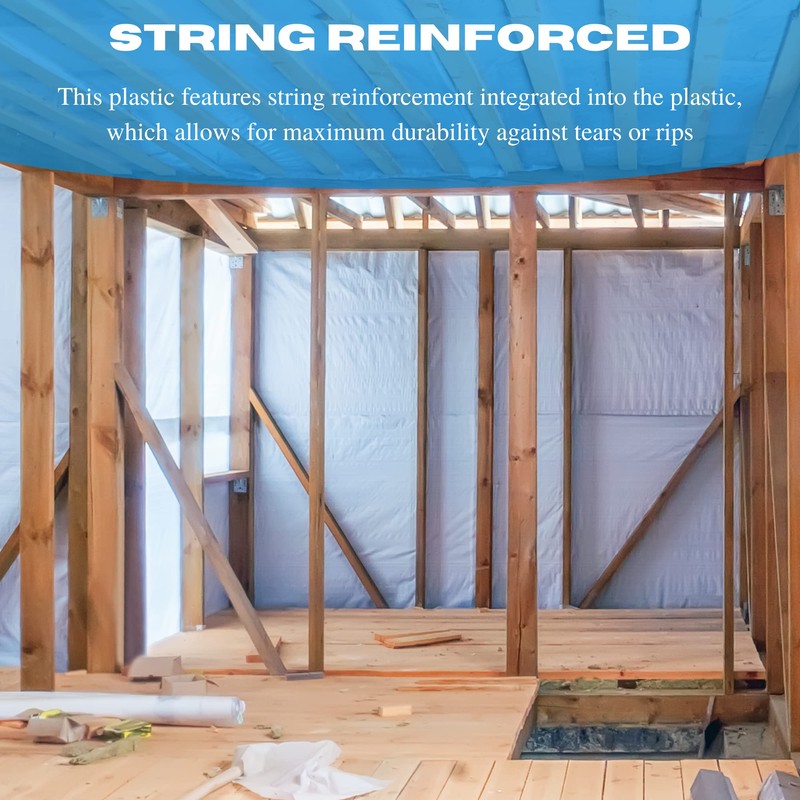 - String Reinforced – This plastic features string reinforcement integrated into the plastic, which allows for maximum durability against tears or rips. Our White plastic sheeting can be used as window plastic for winterizing, carpet covering protection, underlayment for laminate flooring, spray barrier and more!