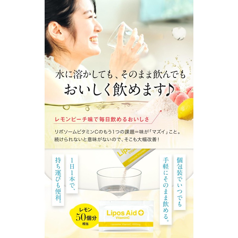 - ✨ナノサイズのリポソーム化で持続力が200%以上UP:ナノサイズのリポソームは、人間の細胞(腸上皮細胞)の約300分の1のサイズ。ナノサイズのリポソーム化により、体内の血中濃度が通常のビタミンCより200%以上にUPします。 ✨おいしいから続けやすい:レモンピーチ味で毎日飲めるおいしさに仕上げました。水に溶かしても、そのまま飲んでもおいしく飲めます♪