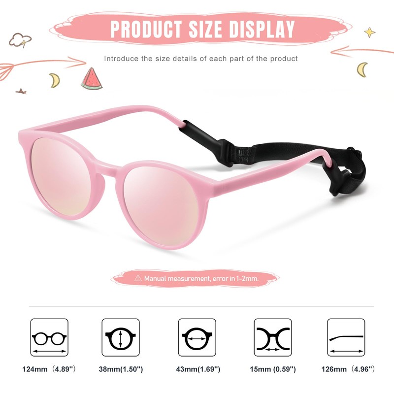 Vcarsian Cute Kids Polarized Sunglasses,Baby Sun Glasses with Strap for Toddler Girls Boys Flexible Round UV400 Protection Glasses Age 0-6