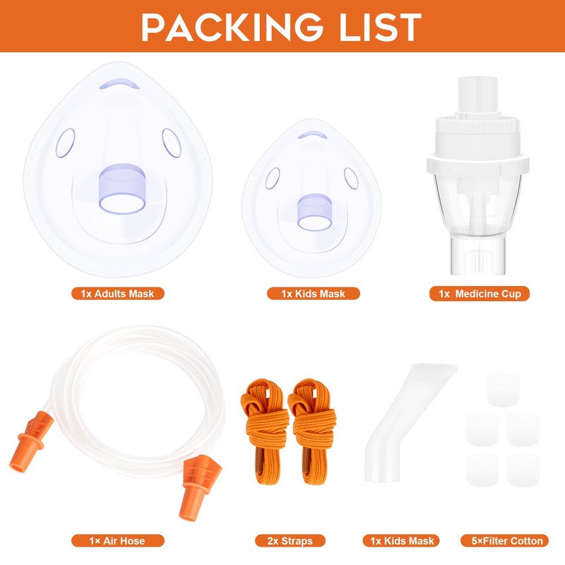 • Complete AccessoriesAdult mask*1, Child mask*1, 2*Straps, 1*Mouthpiece, 1*Instruction Manual, 1*Cup, 5*Cotton Filter