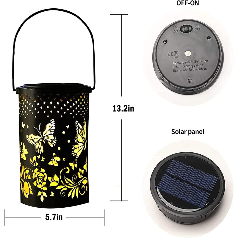 - SOLAR BUTTERFLY LIGHTS OUTDOOR WATERPROOF -solar hanging lantern made of high-quality Brass, has an IP65 waterproof rating, the large solar lantern can cope with various weather conditions in the outdoor environment, No more worries about raining, snowing, perfect for outdoor use.