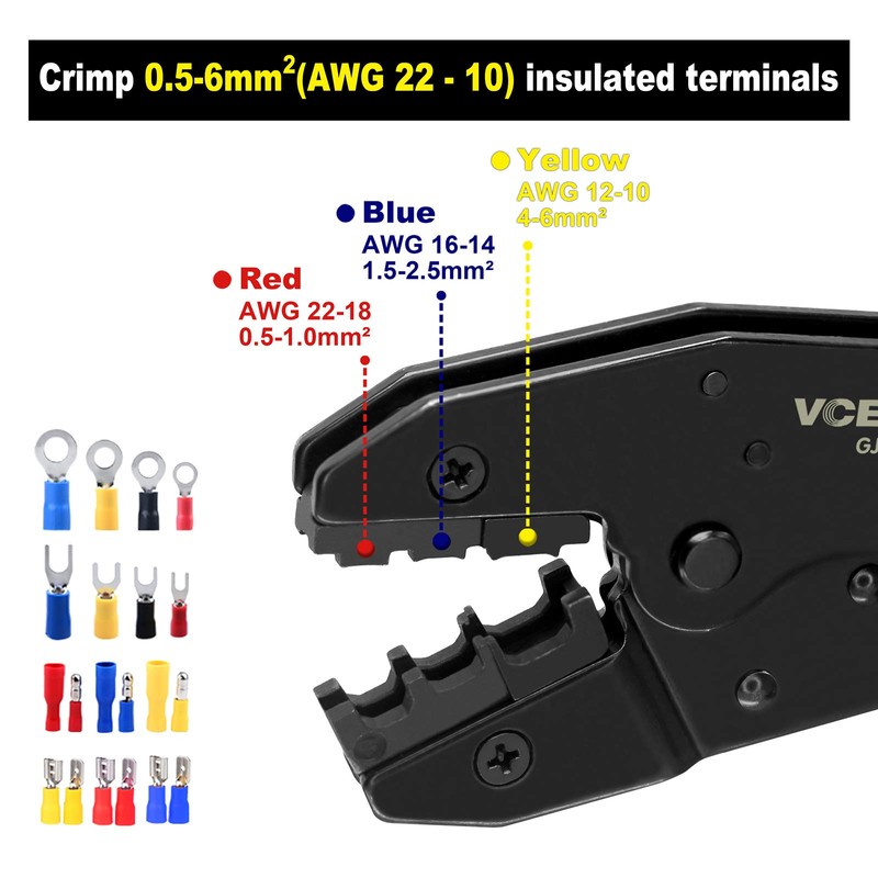 - Precise Crimping Pliers: high-precision terminal crimping holes, which means that the terminals can be pressed onto the wire without damaging the terminals. Red(0.5 mm² - 1 mm²) , blue(1.5 mm² - 2.5 mm²),yellow(4 mm² - 6 mm²).