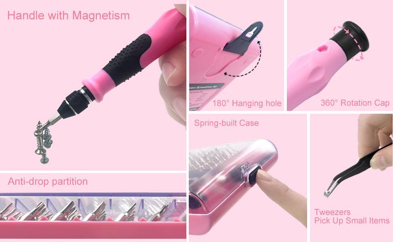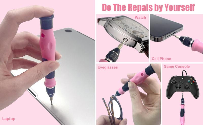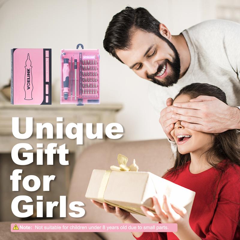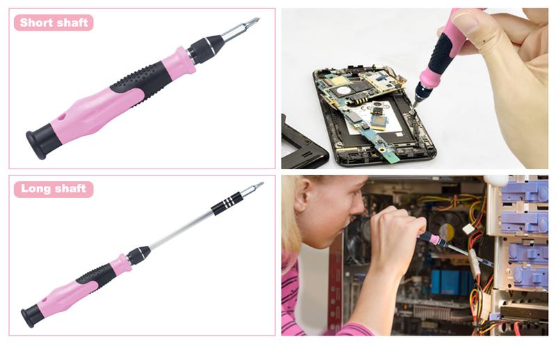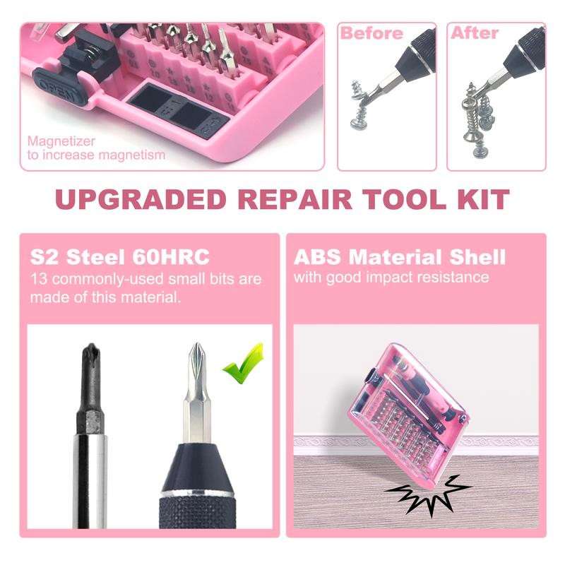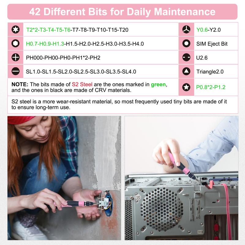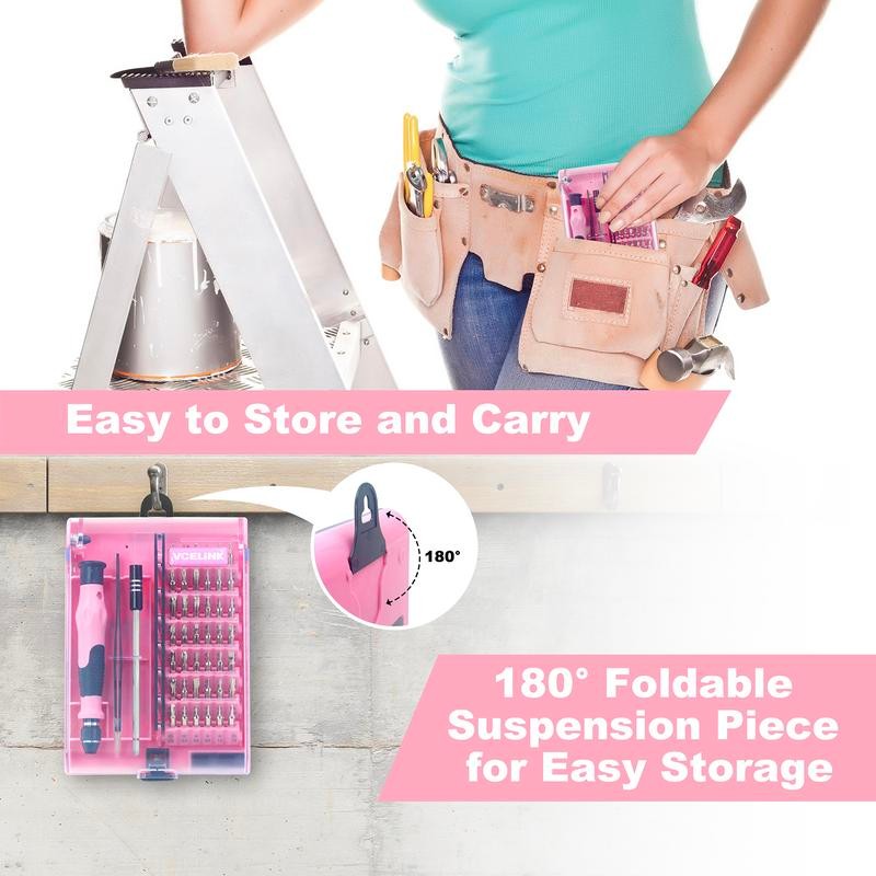 • VERSATILE GIFT FOR HER: This pink tool set is a handy household tool kit for girls. The pretty appearance makes it a perfect and practical present for mother, daughter, wife, DIY enthusiasts, and friends on occasions such as Mother's Day, birthdays, Christmas, and anniversaries. With 42Pcs high-precision Bits in 9 different universal types, it can be used in essential home maintenance, DIY projects, professional electronics repair, etc.