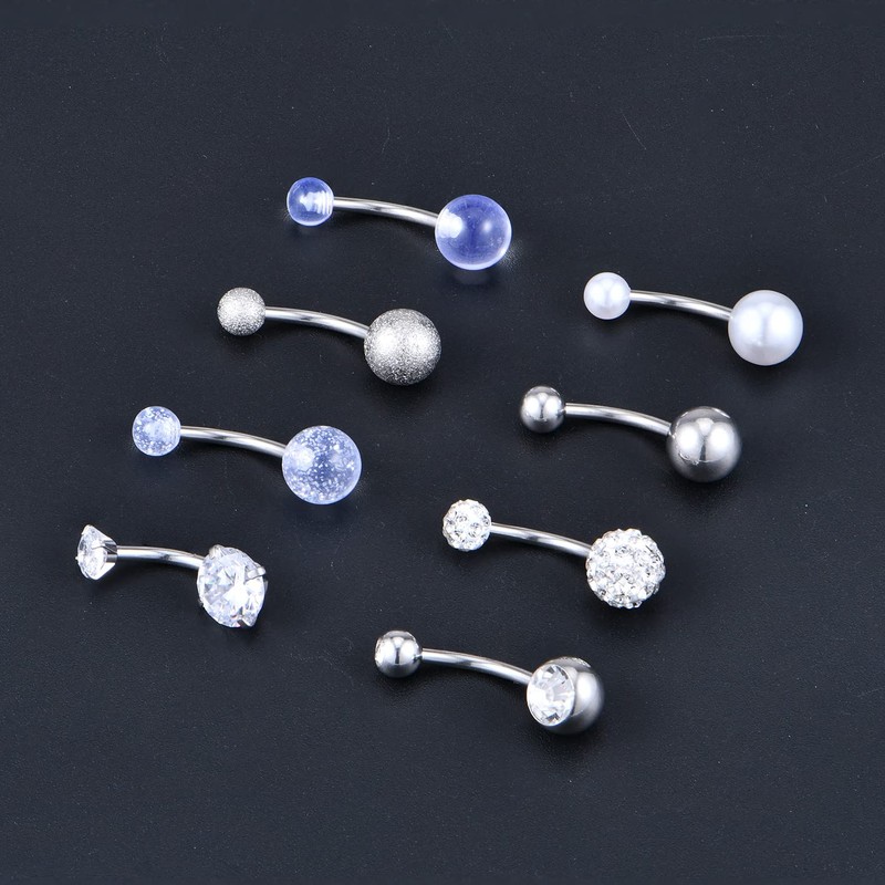 - Package includes: 8 different styles belly button piercings, comes with a beautiful free velvet bag