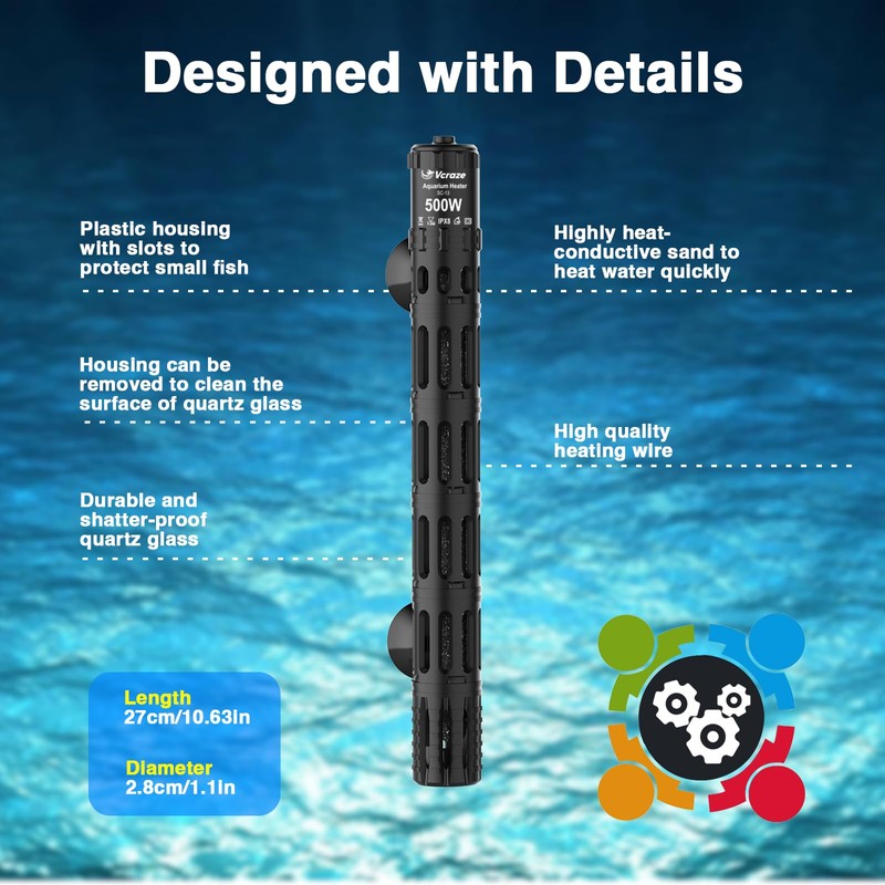 VCRAZE Fish Tank Heater with LED Digital Display Thermostat, Submersible Aquarium Heater with Protective Housing, 500W Adjustable Fish Heater for 75-120 Gallon Tanks