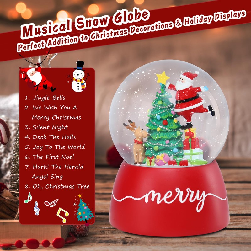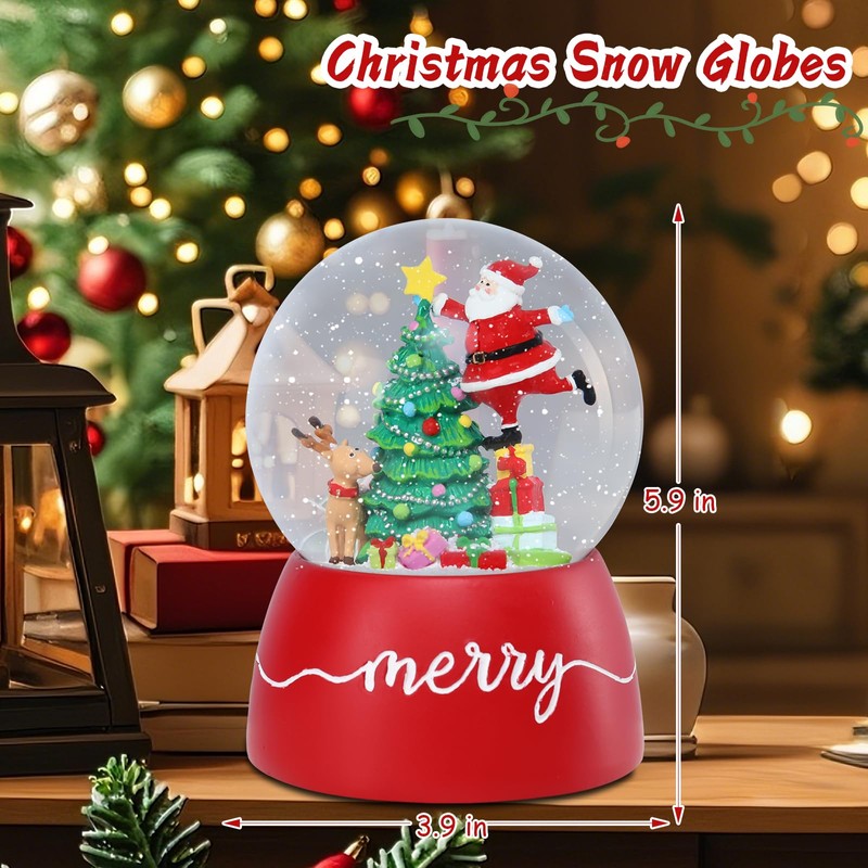 - Various Occasions: Featuring Santa Claus and an elk decorating the Christmas tree on a red retro base, this snow globe is perfect for gifting to friends and family. Measuring 4"W x 5.9"H and made from high-quality ABS, water, and glass materials, it is suitable for display on the fireplace mantel, window sill, or dining table