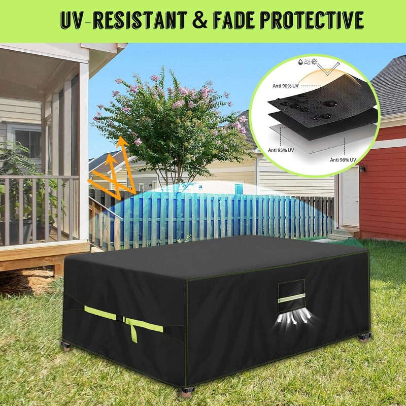 - Excellent waterproof: the covers for tables have passed the hydrostatic pressure test, which can withstand a water pressure of up to PU 8000 mm. To improve the water resistance function, we have used double seams and extra waterproof tape is specially added to the seams, effectively prevent water from entering the garden furniture from the seams.