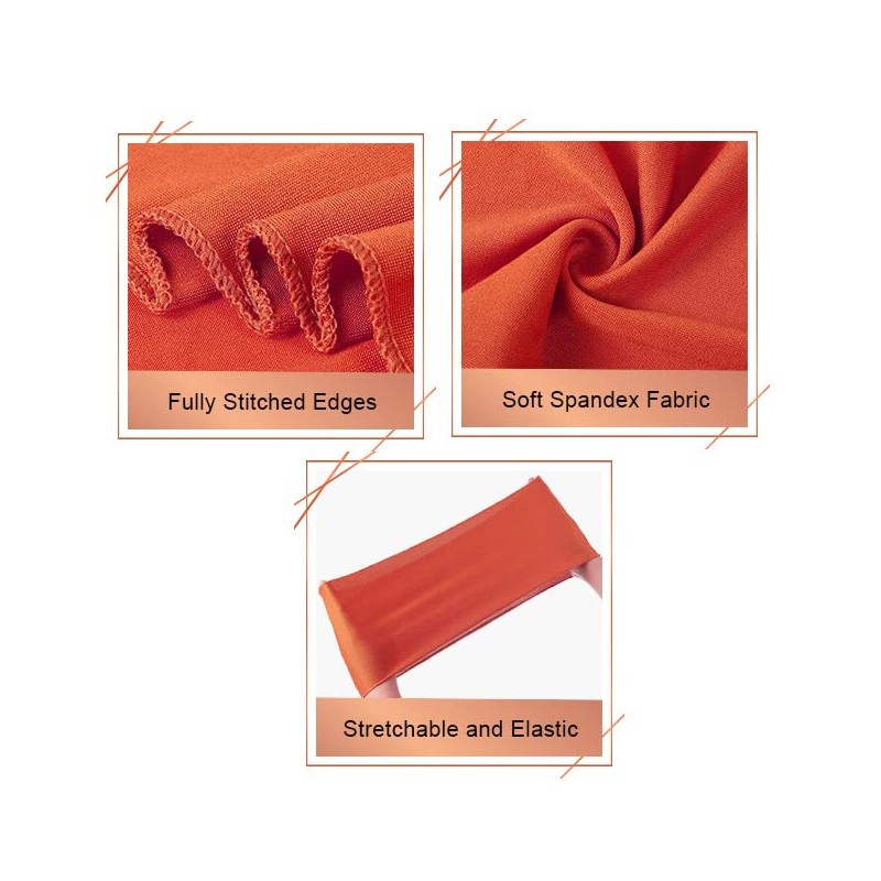 - 💚 PERFECT SIZE: High quality spandex with good elasticity, stretch to fit almost chairs. It is 90% Polyester and 10% Spandex. Size: 5.9" x 14" Or 14cm (W)*35cm(L). Fit for all type chairs (35-50CM Chair Back Width). Package Includes: 100 PCS Chair Sashes.