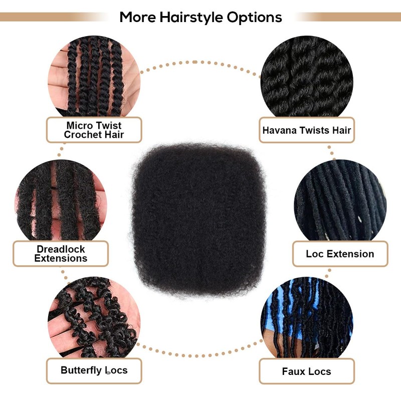 - Variable Hairstyle : You can make your own dreadlock extensions, It is thick which makes it easy to crochet into dreadlocks,Afro Kinky Bulk Human Hair also can do micro locs, micro twist , butterfly locs, faux locs, passion twist crochet braids and so on. Afro Kinky Bulk Human Hair is perfect for repairing damaged or loose braids, it can be used to add length, volume and texture to your hair, making it look healthier.