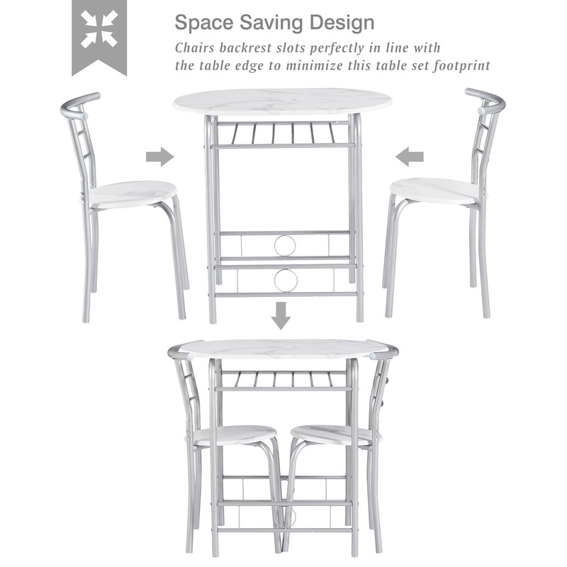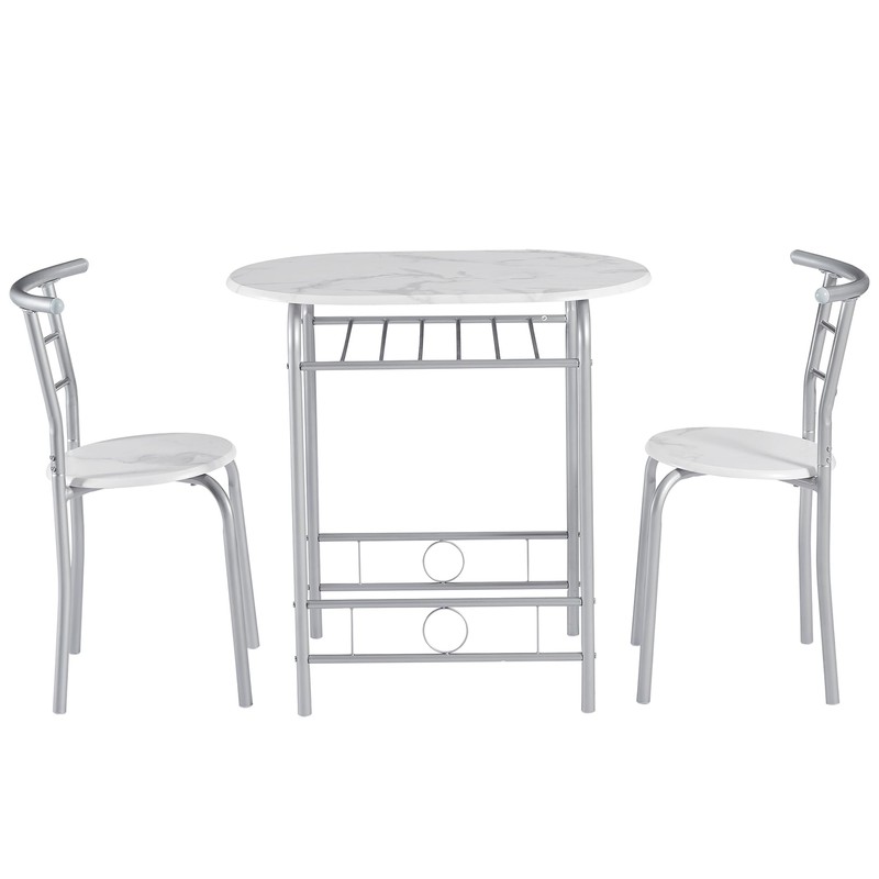 VECELO 3-Piece Dining Table Set for Kitchen Breakfast Nook, Faux Marbled Oval Tabletop and Metal Frame with Built-in Wine Rack, for Small Spaces, White & Silver