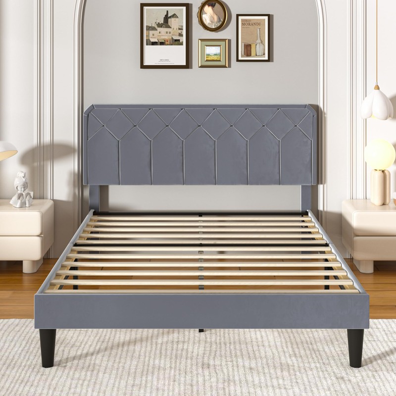 VECELO Full Size Bed Frame Premium Velvet Upholstered Platform with Height Adjustable Headboard/Mattress Foundation, Solid Wooden Slat Support, No Box Spring Needed/Easy Assembly