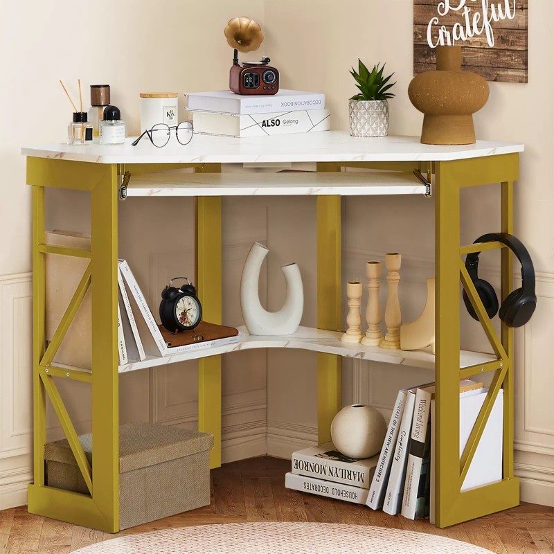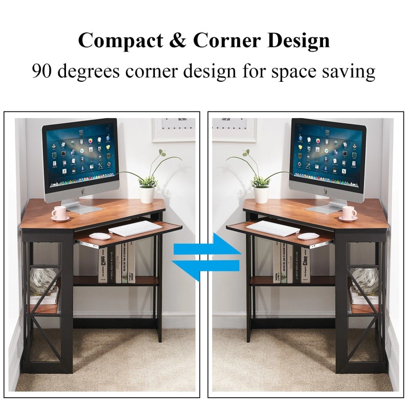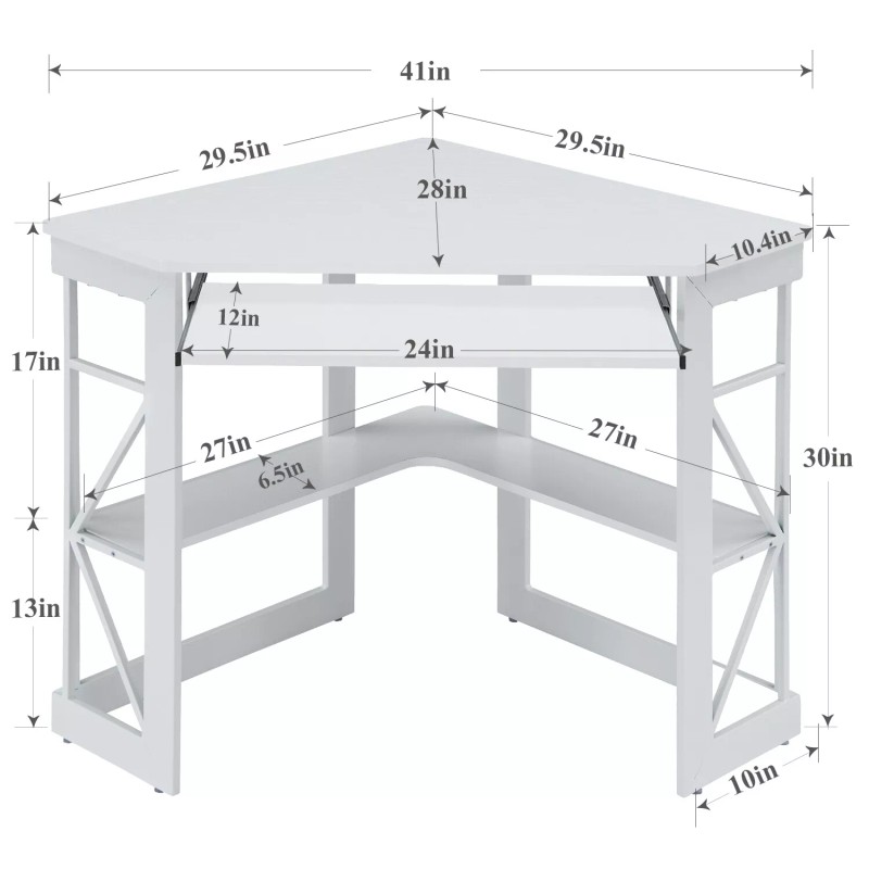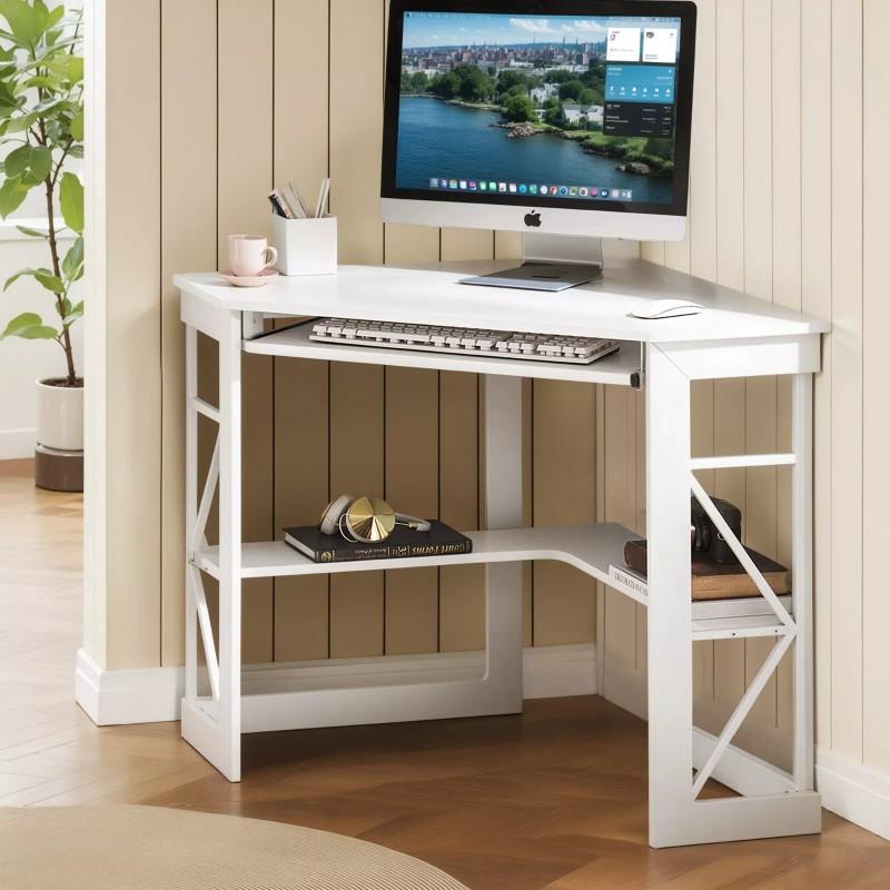 Vecelo Home Office Table Corner Desk Laptop Computer Table Keyboard Tray & bookShelf - White