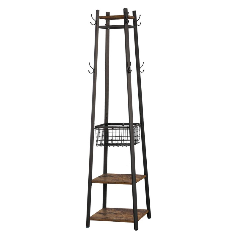 VECELO Industrial Coat Rack,Enterway Clothes Stand with 2 Tier Storage Shelves and Metal Basket,Upgrade Hall Trees with 8 Dual Hooks,Antique Brown
