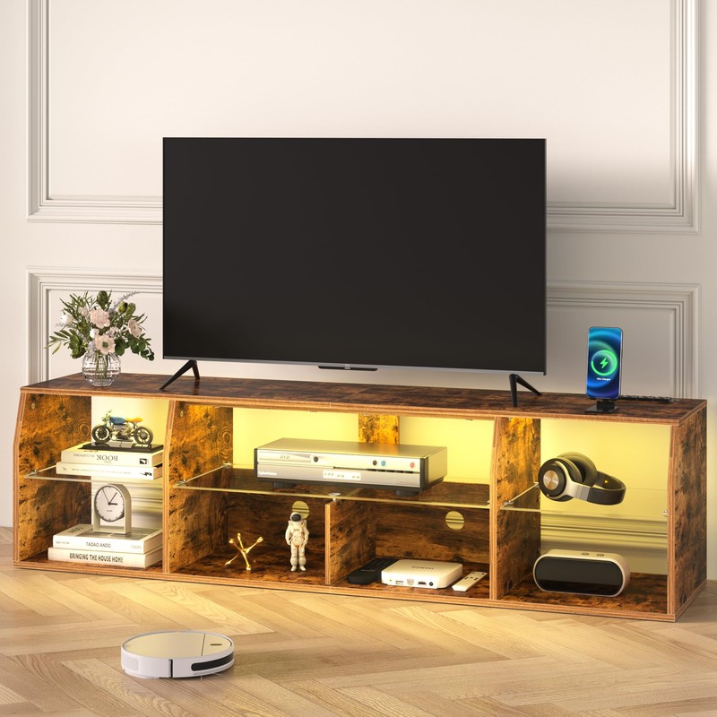 VECELO LED TV Stand with Lights & Power Outlet for 70 inch, Gaming Entertainment Center with 7 Open Storage Shelves, Industrial Television Cabinet for Living Room, Bedroom, Retro Brown