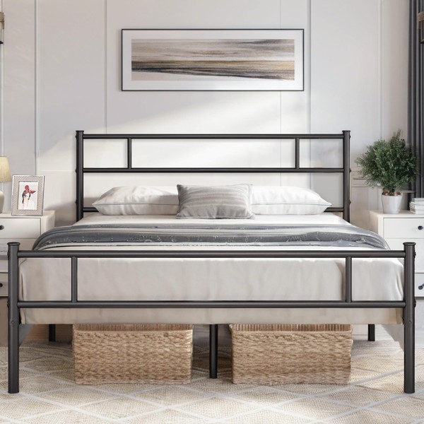 VECELO Metal Platform Bed Frame Queen Size with Headboard and Footboard, 12'' Under-Bed Storage & Strong Slats Support, No Box Spring Needed, Dark Black