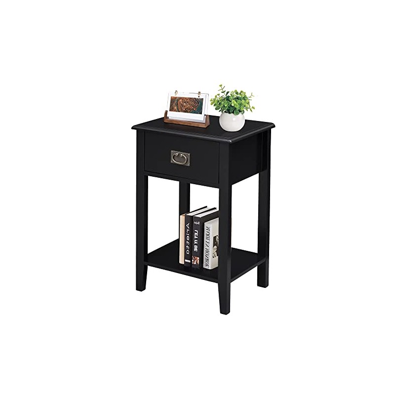 VECELO Nightstands End/Side Tables for Living Room Bedside, Vintage Accent Furniture for Small Space, Solid Wood Legs, Black, One Drawer