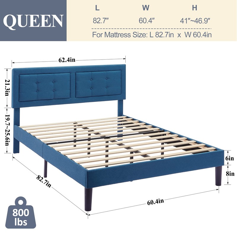 - [EASY ASSEMBLY] This queen platform bed frame with a wooden headboard is designed for effortless assembly. All the necessary parts and tools are smartly packed into one box. The slats of the bed frame feature Velcro attachments, allowing for quick and efficient assembly. You can have your twin upholstered bed fully assembled within one hour. (PLEASE NOTE: MATTRESS SOLD SEPARATELY)