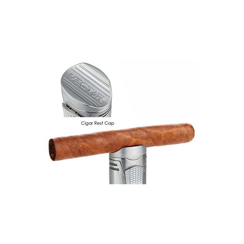 The Ironquad features four torch flames arranged in an elongated diamond configuration. It is wind resistant torch and will work at altitudes of up to 12,000 feet. It also comes with a curved lid that covers the flames that doubles as a cigar rest, while offering a large fuel window on the rear of the lighter and a large flame adjustment wheel on the base of the lighter. The Vector Ironquad measures 1.37″ x 0.94″ x 3.4″ and is available in six colors: Chrome Satin, Gunmetal Satin, Black Matte, Blue Matte, Yellow Matte and Red Matte. Manufacturer's Warranty.