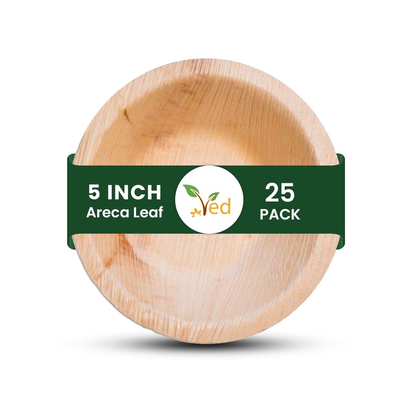 Ved 25 Biodegradable, Eco-Friendly Areca Leaf Bowl Small 5" 12cm(250ml), Deep Round Disposable Serving Bowls, Compostable,for Salad, Party.