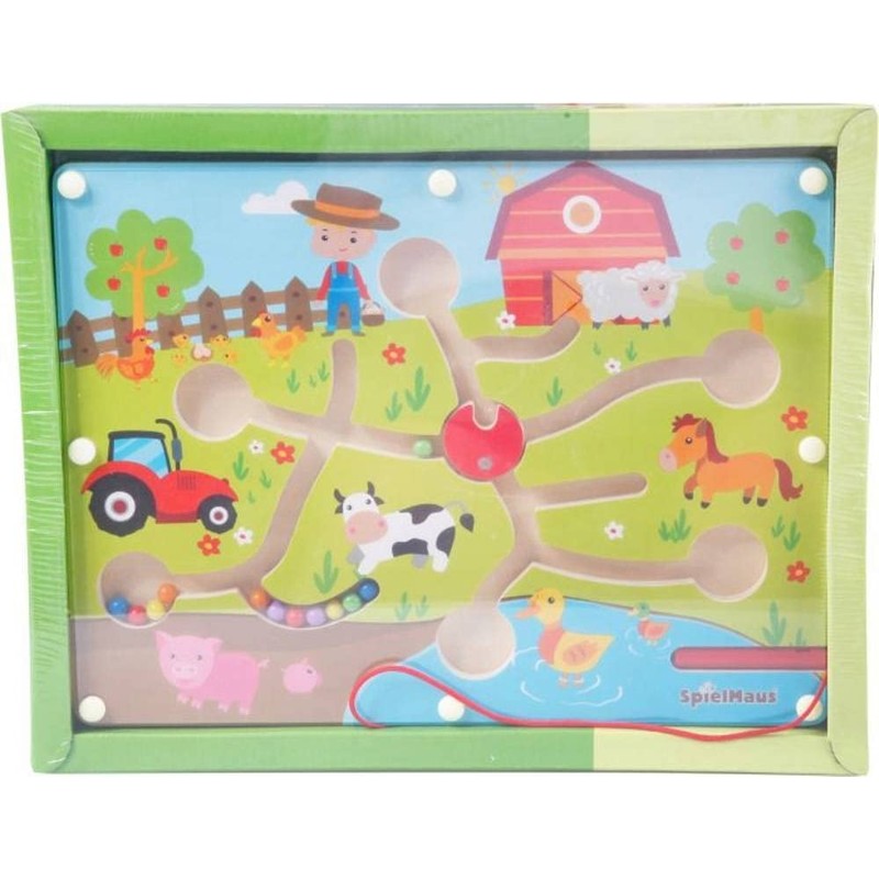 SpielMaus wooden ball maze with magnetic pen. Farm design. With the magnetic pen, the balls are moved and must be matched to the correct colour. Promotes visual observation and fine motor skills. Dimensions: approx. 30 x 22.5 x 2 cm. Suitable for children aged 24 months and up.