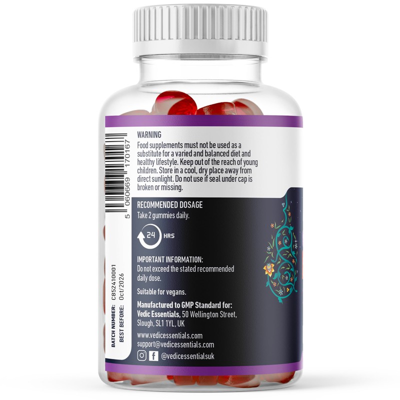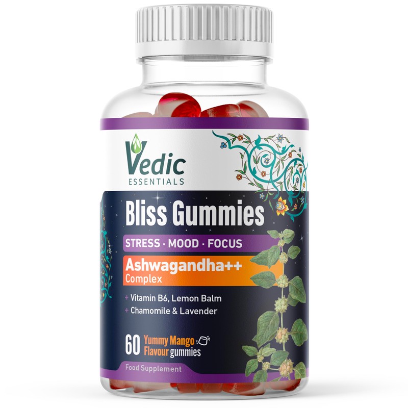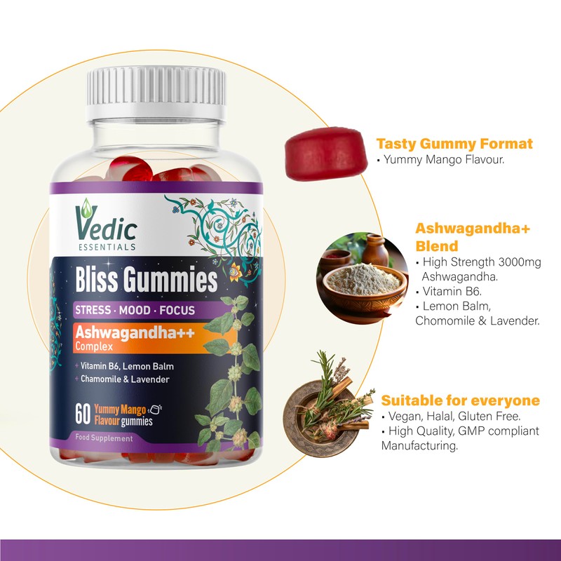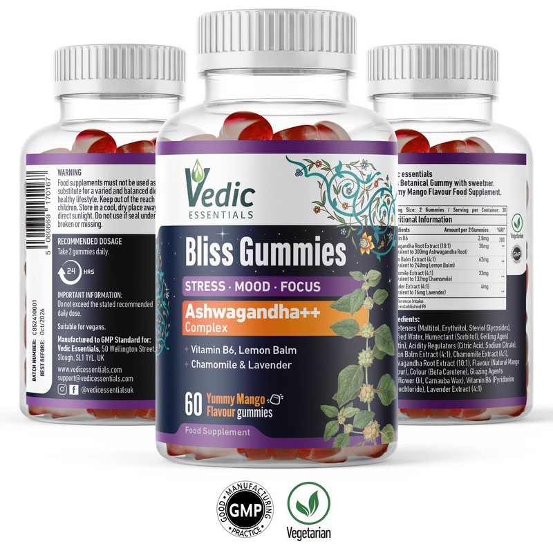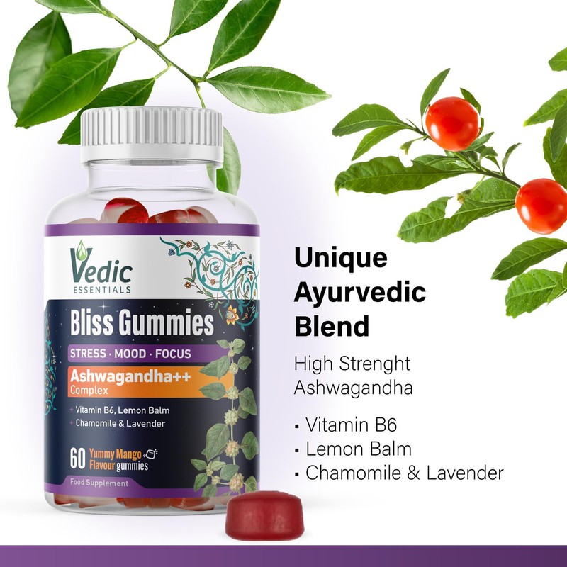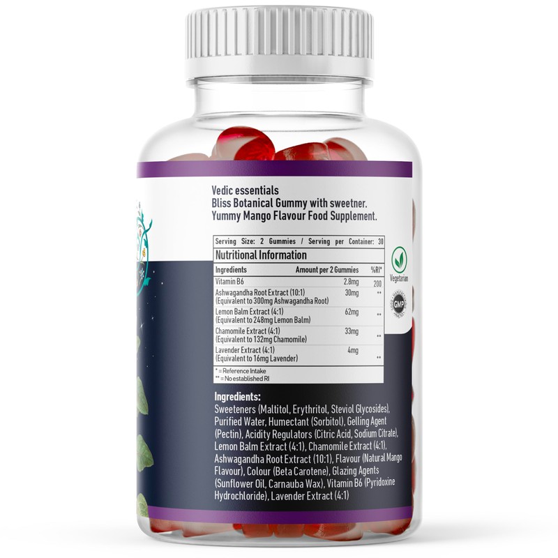Product descriptionVedic Bliss Gummies with Ashwagandha, Lemon Balm, Chamomile, Lavender & Vitamin B6 are Natural Stress & Anxiety Relief supplements developed based on Ayurvedic principles with herbal ingredients. It supports a calm mind and relieves mental fatigues during the day, while promoting good restful sleep during the night. Our unique, high strength Ayurvedic blend with Ashwagandha,Lemon Balm, Chamomile, Lavender & Vitamin B complex is proven to reduce Tiredness, and Fatigue; and helps to support your Mood and Boost Energy through the day. The tasty natural mango flavour gummies format is convenient for everyday use and helps to bring the best in you everyday!IngredientsSweeteners (Maltitol, Erythritol, Steviol Glycosides), Purified Water, Humectant (Sorbitol), Gelling Agent (Pectin), Acidity Regulators (Citric Acid, Sodium Citrate), Lemon Balm Extract (4:1), Chamomile Extract (4:1), Ashwagandha Root Extract (10:1), Flavour (Natural Mango Flavour), Colour (Beta Carotene), Glazing Agents (Sunflower Oil, Carnauba Wax), Vitamin B6 (Pyridoxine Hydrochloride), Lavender Extract (4:1)DirectionsRECOMMENDED DOSAGE: Take 2 gummies daily.Safety WarningKeep out of the reach of young children. Store in a cool, dry place away from direct sunlight. Do not use if seal under cap is broken or missing. Suitable for vegans.Legal DisclaimerFood supplements must not be used as a substitute for a varied and balanced diet and healthy lifestyle.Take 2 gummies daily.Do not exceed the stated recommended daily dose.
