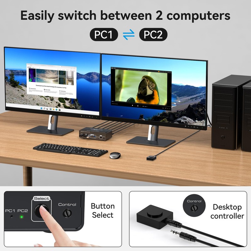 The 2 pc 2 monitor switch part space and time as it can be switched with just one push of a button, eliminating the frequent plugging and unplugging of cables.