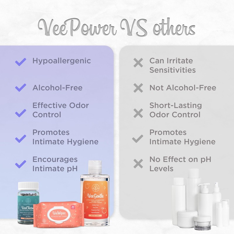 - 🧡 3 CONTROL AND PREVENT VAGINAL ODOR WITH VEEPOWER - When you want supreme vaginal hygiene, our VeePower Bundle will have you fresh and confident in no time! Included are our VeeCleanse Boric Acid Suppositories to combat odor, VeeGentle pH Balancing Feminine Wash, and VeeWipes.