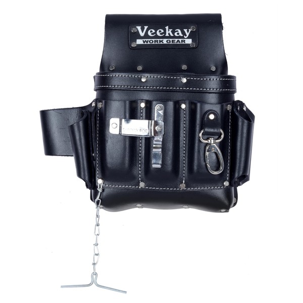 - 100% Leather: Crafted from premium full-grain leather with highest attention to detail, this electrician's tool pouch is designed for comfort and safety. It features chrome-finished hardware and comes in a rich black color.