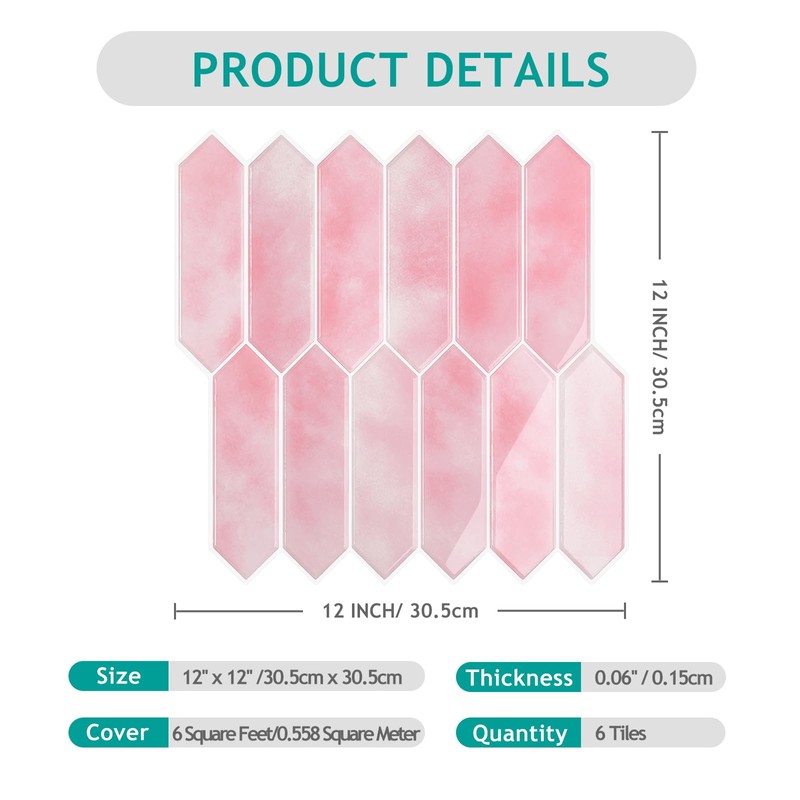 - ๐๐ซ๐จ๐๐ฎ๐๐ญ ๐๐๐ญ๐๐ข๐ฅ๐ฌ: Peel and stick backsplash, pink peel and stick tile backsplash, long hexagon design, glossy finish, made of high quality vinyl, durable, flexible, light weight, 12''x12''x0.05'', 6 tiles included, 6 square feet each box