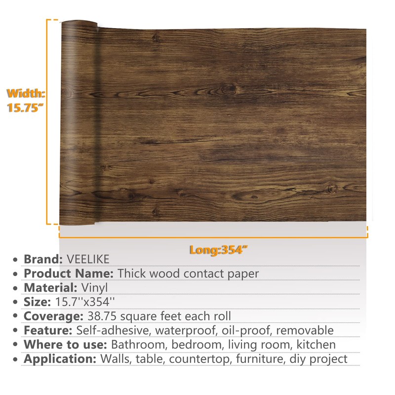 - 〚Size & Material 〛This wood contact paper is 15.7 inches wide by 354 inches long, per vinyl roll covers 38.75 square feet. Made of high quality vinyl, durable and eco-friendly, thickened texture, tear-resistant, retro style