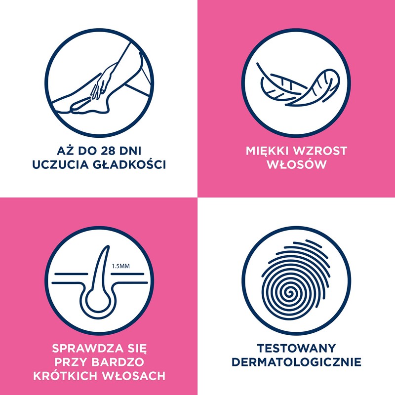 - Removes hair and roots and gives smooth skin for up to 28 days.